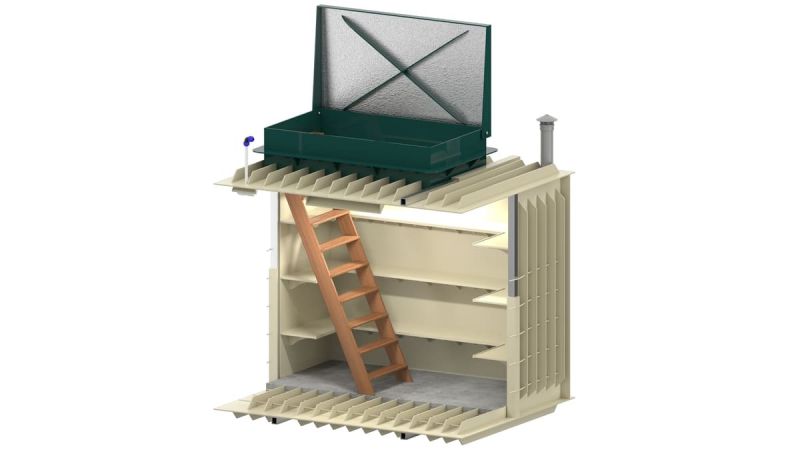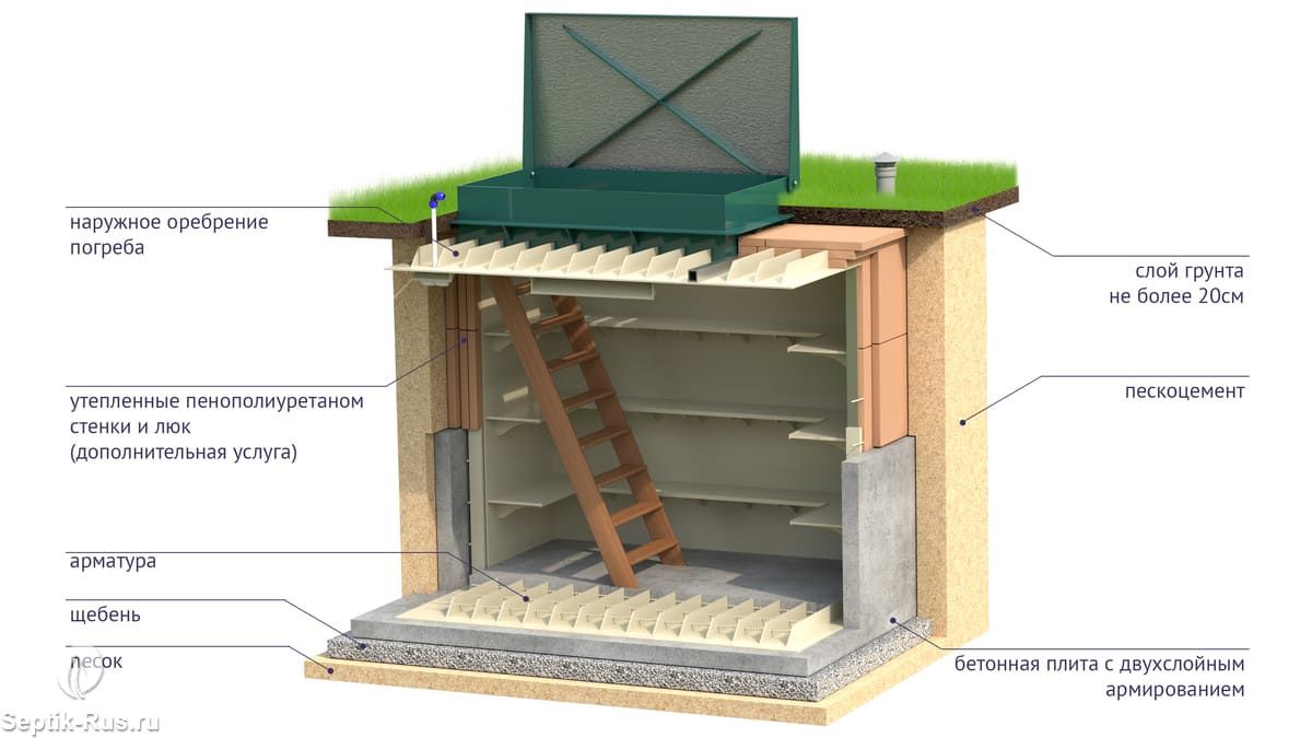 Вертикальный вход в погреб и двери доставляются отдельно и монтируются на участке.