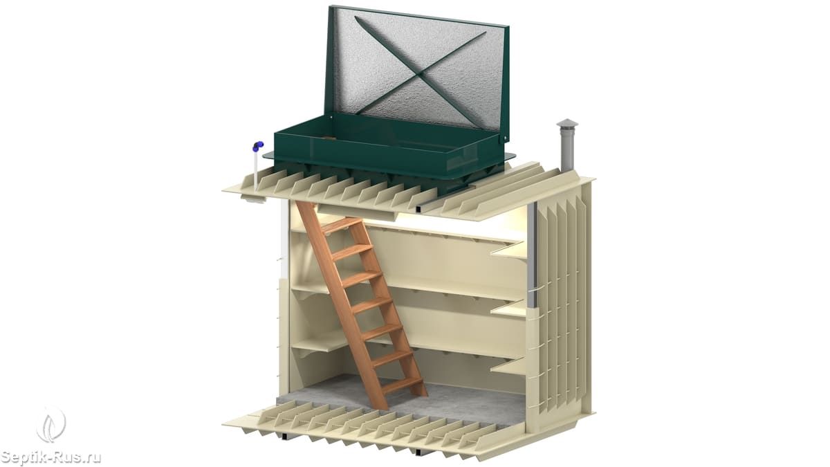 Конструкция устройства представляет собой заглубленное герметичное техническое помещение габаритами 2.5*1.5*2 м, оснащенное системой вытяжной и проточной вентиляции, установленным освещением.