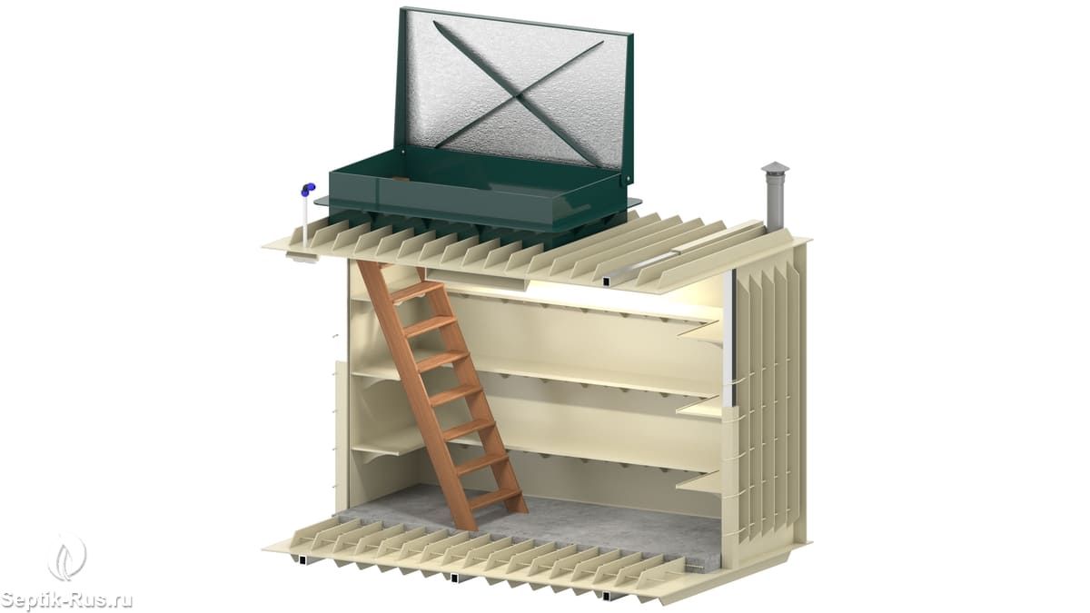 Конструкция устройства представляет собой заглубленное герметичное техническое помещение габаритами 3*2*2 м, оснащенное системой вытяжной и проточной вентиляции, установленным освещением.