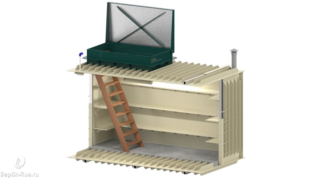 Конструкция устройства представляет собой заглубленное герметичное техническое помещение габаритами 3.5*2*2 м, оснащенное системой вытяжной и проточной вентиляции, установленным освещением.
