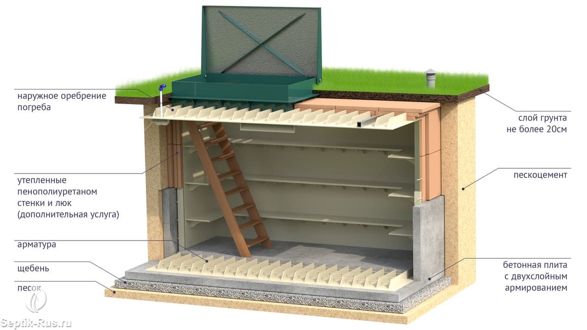Вертикальный вход в погреб и двери доставляются отдельно и монтируются на участке.