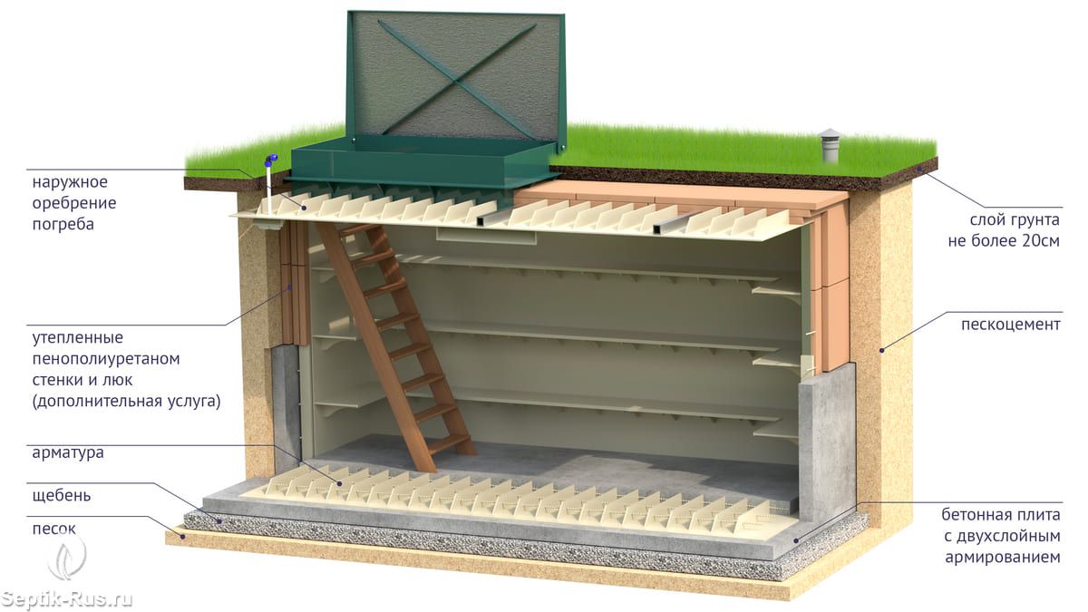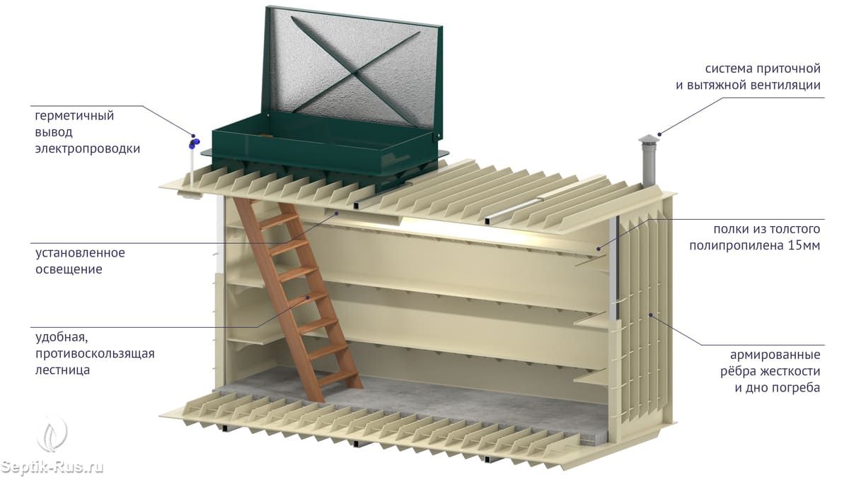 Вертикальный вход в погреб и двери доставляются отдельно и монтируются на участке.