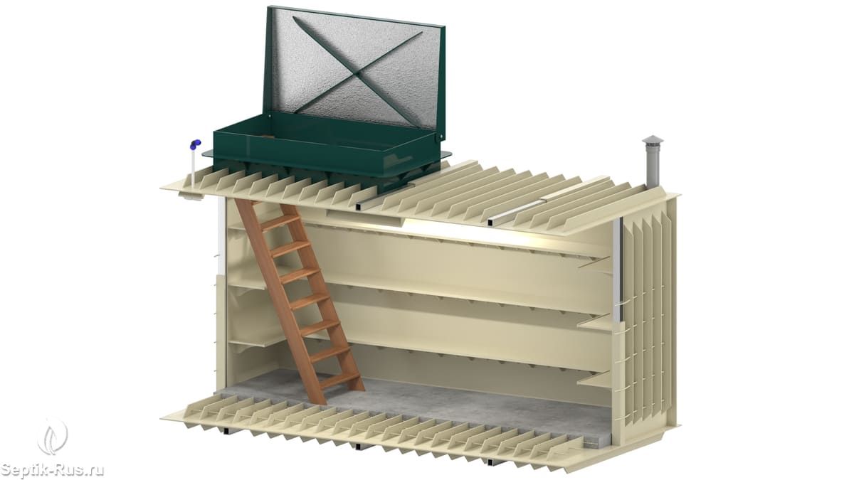 Конструкция устройства представляет собой заглубленное герметичное техническое помещение габаритами 4*1.5*2 м, оснащенное системой вытяжной и проточной вентиляции, установленным освещением.