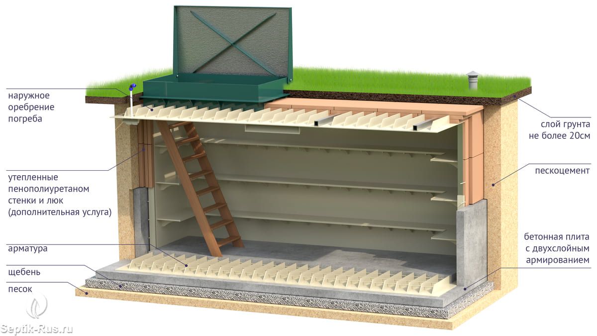 Вертикальный вход в погреб и двери доставляются отдельно и монтируются на участке.