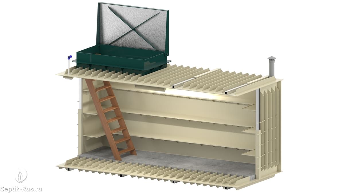 Конструкция устройства представляет собой заглубленное герметичное техническое помещение габаритами 4.5*2*2 м, оснащенное системой вытяжной и проточной вентиляции, установленным освещением.