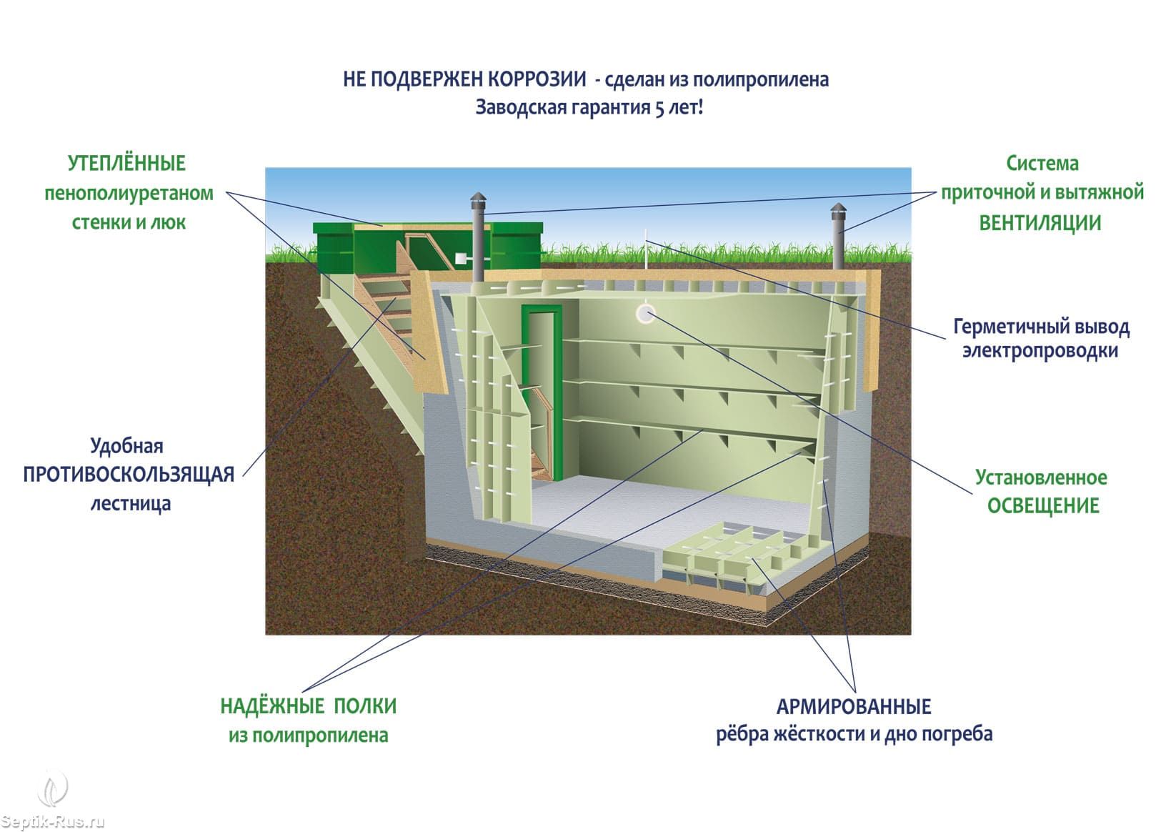 Материал изготовления погреба – пищевой полипропилен блок-сополимер - экологичный материал, который абсолютно безвреден для продуктов питания, здоровья человека и домашних животных. Полипропилен не поддается коррозии и гниению, обеспечивает герметичность конструкции.