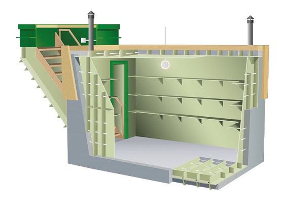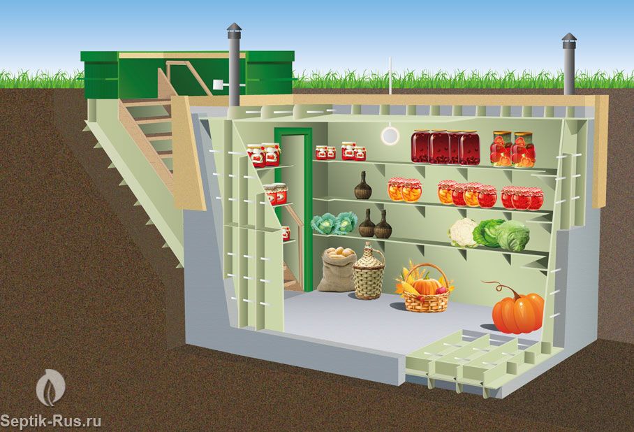 Данная модель ГРИНЛОС Погреб обладает рабочей камерой размерами 1.5х1.5х2, которая устанавливается под землю. Вход в погреб выполнен горизонтально и осуществляется по коридору с лестницей. Размеры погреба со входом составляют 6.2х1.5х2.4 м. Для дополнительной защиты от промерзания имеется возможность установки второй двери. Погреб поставляется полностью укомплектованным и предназначен для круглогодичного хранения продуктов питания – овощей, солений и др. домашних запасов.