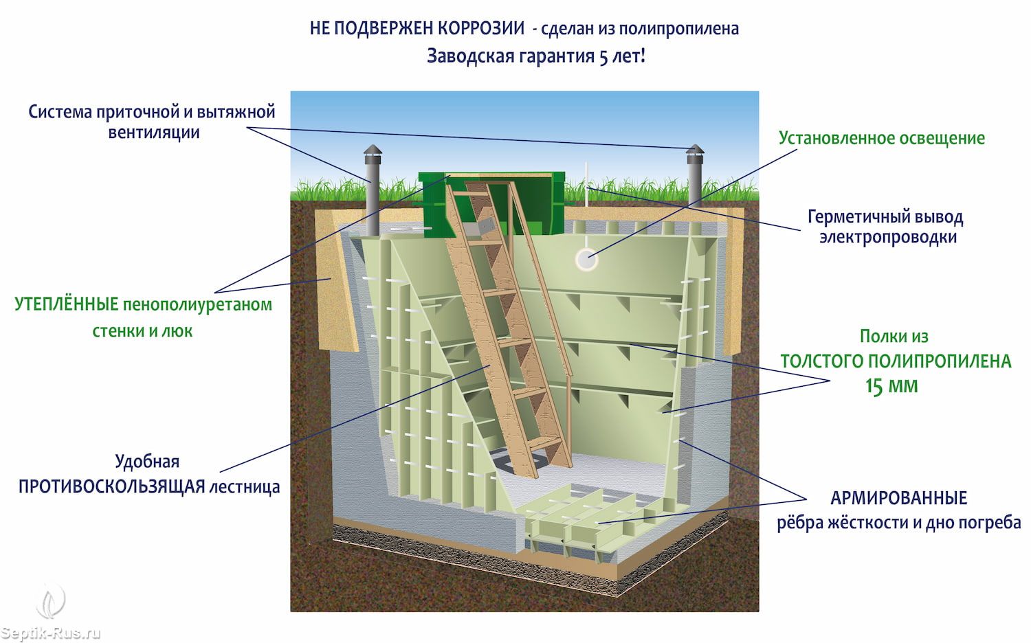 Гринлос Погреб ЛС 3500*1500*2000 – это погреб из пищевого полипропилена, который является экологичным материалом, неподверженным коррозии. Он абсолютно безвредный для здоровья человека и домашних животных. Благодаря этому, он идеально подходит для круглогодичного хранения продуктов питания – овощей, солений и др. домашних запасов.