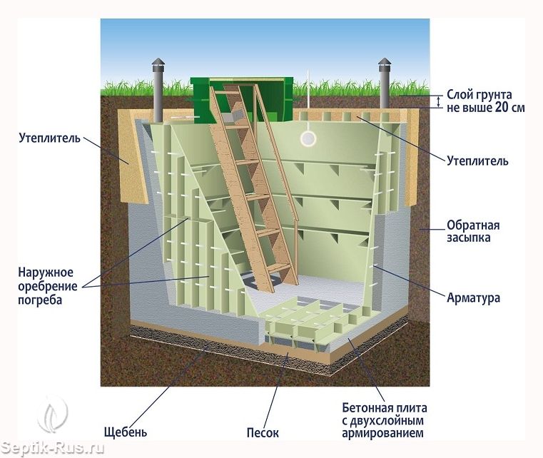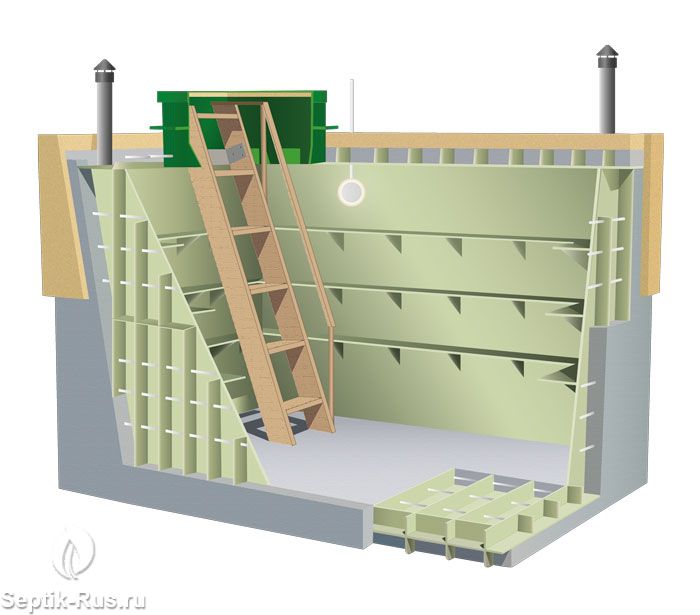 Конструкция устройства представляет собой заглубленное герметичное техническое помещение габаритами 3.5*1.5*2 м, оснащенное системой вытяжной и проточной вентиляции, установленным освещением.
