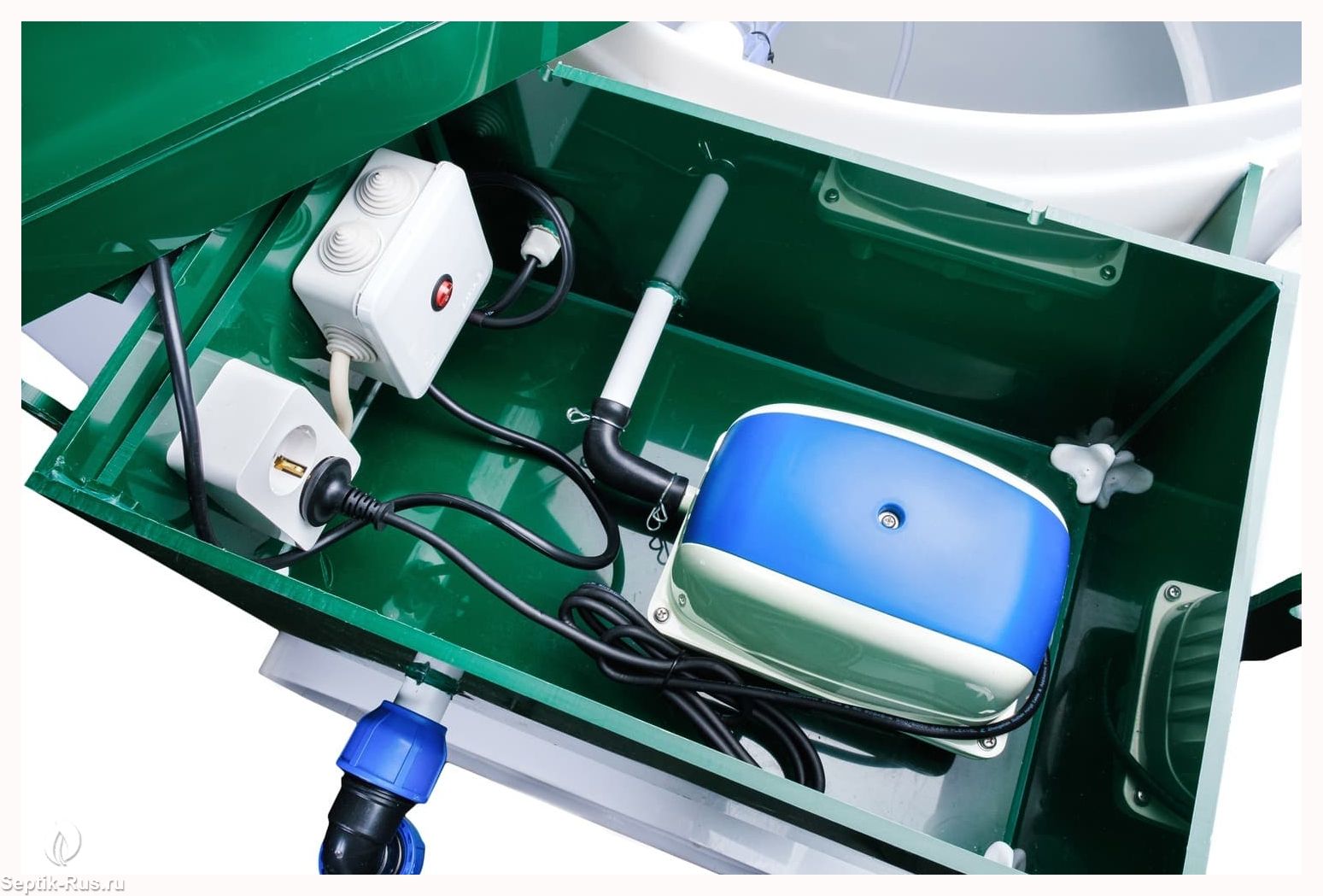 За счет вынесенного блока электроники, компрессор Биодевайс Gorizont 5 полностью защищен от попадания воды и выхода из строя. - 99% очистки сточных вод.