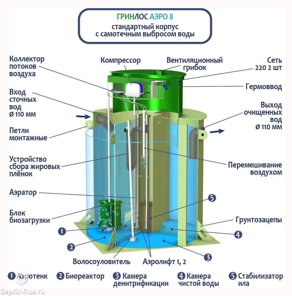 Из третьей камеры, после многочисленных циклов очистки, чистая техническая вода, через специальный перелив – успокоитель попадает в пятый, финишный отсек, откуда, в зависимости от модели (самотечная или принудительная) выводится наружу (на грунт, в дренажную или ливневую канаву и т.д.). Неразложившиеся остатки ила, осевшие на дне, эрлифтом подается в иловый стабилизатор. При принудительном варианте отвода стоков дренажный насос располагается выше уровня забора стоков эрлифтом.