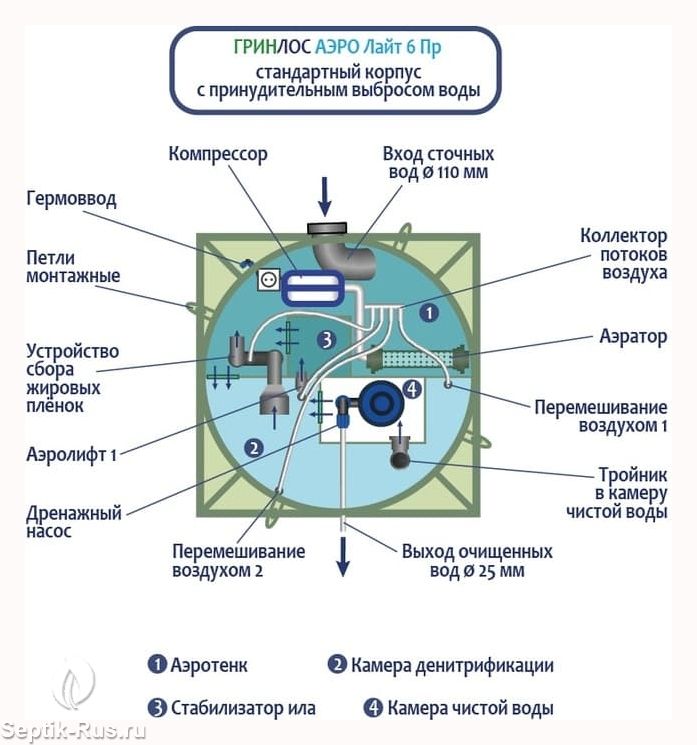 Модификация Гринлос Аэро Лайт 6 Пр выступает менее затратной в изготовлении и эксплуатации относительно септика Аэро .