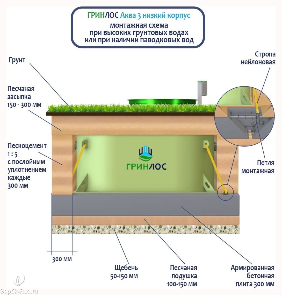 Перед непосредственным монтажом ГРИНЛОС Аква 3 низкий корпус специалисты осуществляют подготовку котлована. Его размеры определяются конструктивными особенностями выбранной модели оборудования.