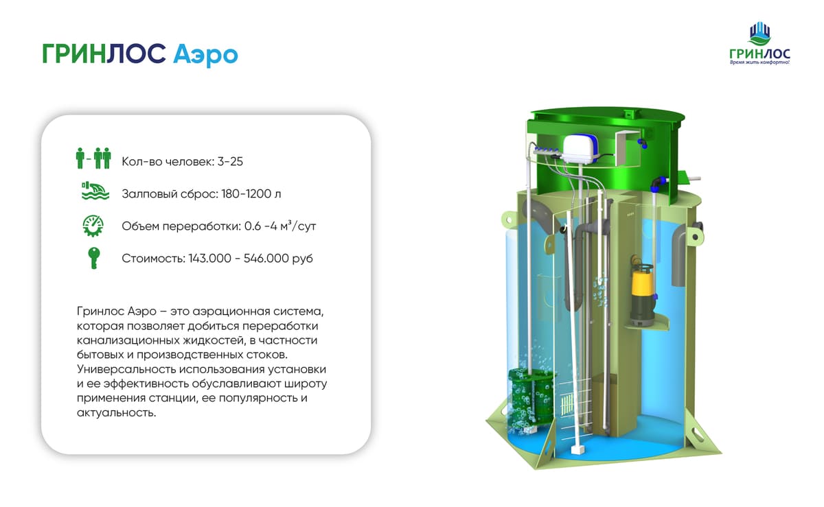 Септики ГРИНЛОС Аэро предназначены для расщепления и переработки основных органических загрязнений, содержащихся в бытовых сточных водах.